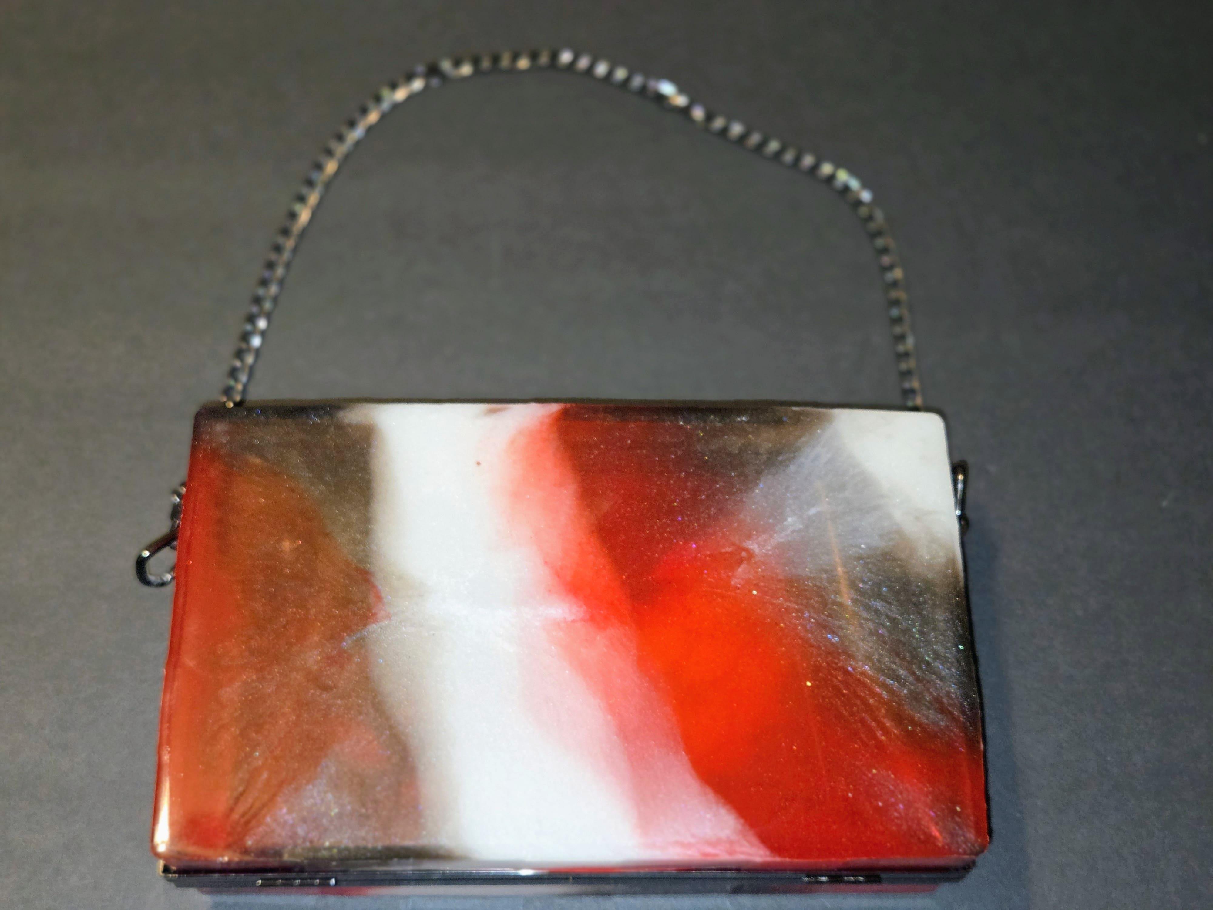 Make a bold, refined statement with this one-of-a-kind handcrafted resin clutch. Designed with a dramatic fusion of rich crimson, soft pearl white, and smoky tones, the surface flows in an elegant, marble-like pattern that feels both modern and timeless. The front is artfully adorned with precision-cut mirror pieces, creating a striking reflective effect that captures and plays with light from every angle.