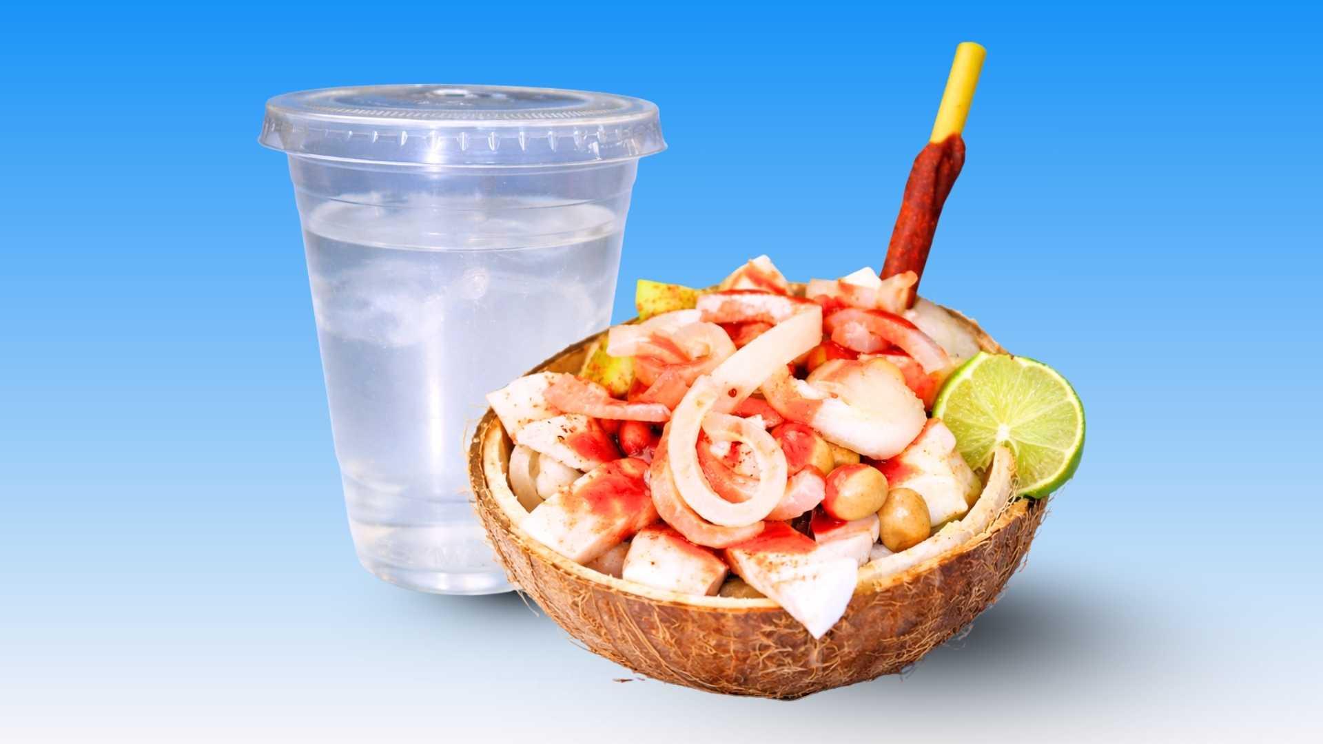 Coco servido con su agua de coco 100% natural, directamente del coco.