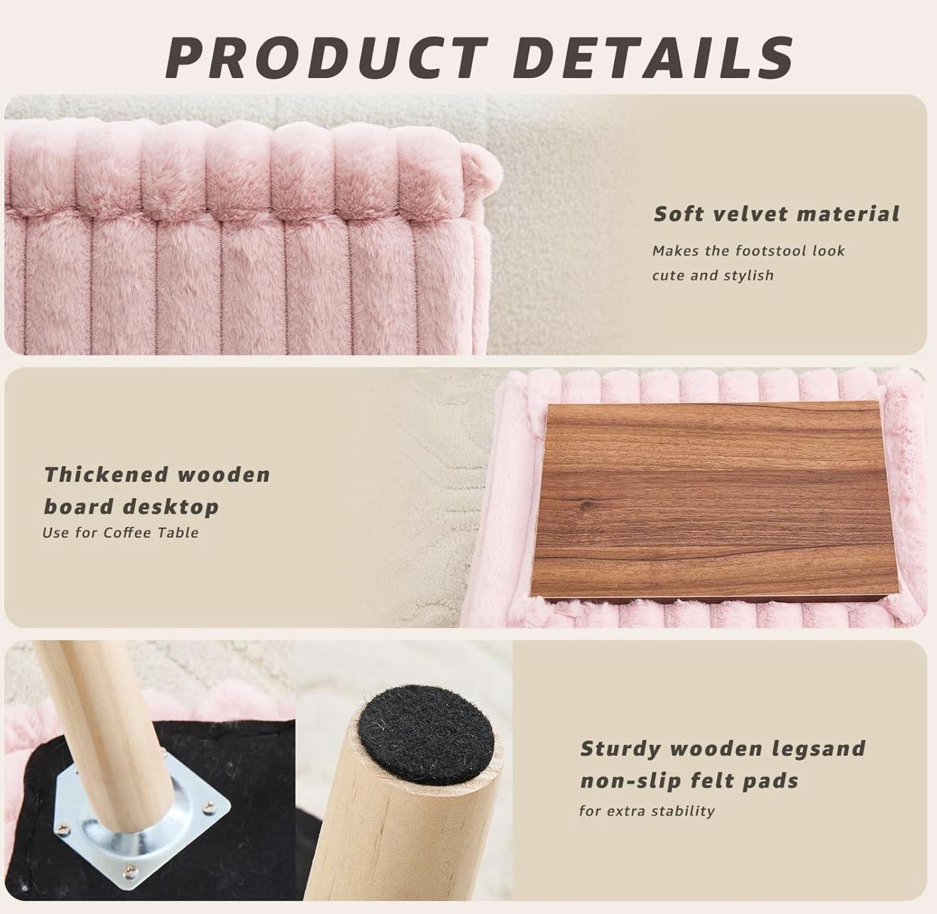 Chic and space-saving, this pink faux fur storage ottoman doubles as a seat, footrest, coffee table, and storage box. With a hidden compartment and sturdy wood legs, it’s the perfect multifunctional piece for tiny homes, apartments, or any small space.