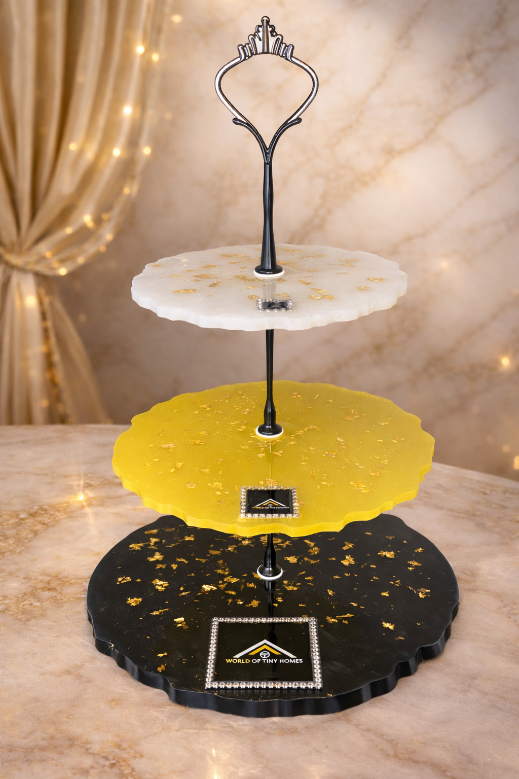 The tiers showcase a bold, modern color palette—black, golden yellow, and soft white—each accented with delicate metallic flecks that add a subtle touch of luxury. Perfect for serving desserts, pastries, cupcakes, fruit, or decorative displays.