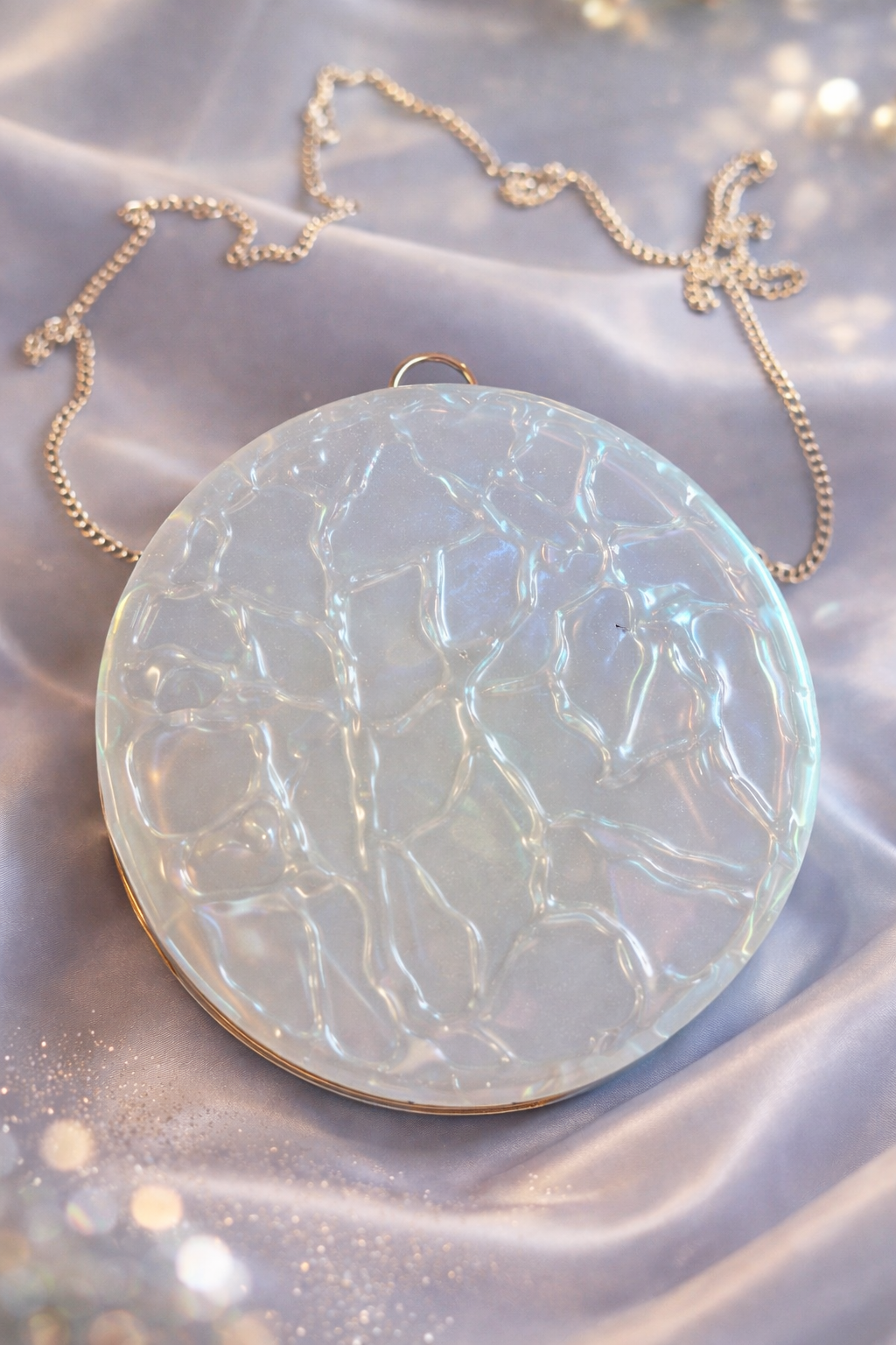 Indulge in refined elegance with this exquisite handcrafted resin compact purse. Designed with a luminous, pearlescent translucence, this piece captures light with a soft, ethereal glow. The flawless round silhouette is framed by polished gold-tone hardware and finished with a classic clasp, offering both sophistication and timeless appeal.