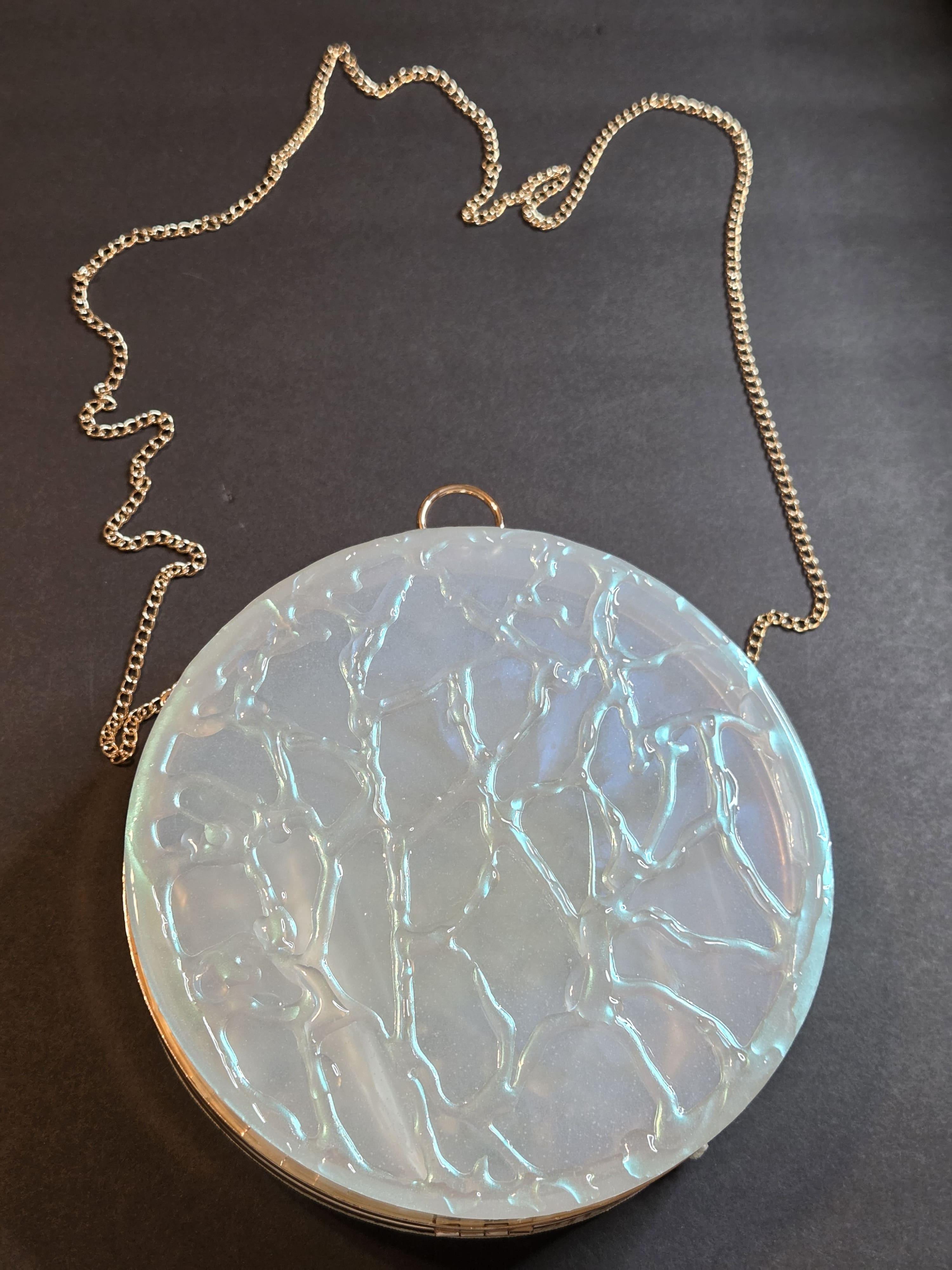 Unique handmade featuring a shimmering, pearlescent surface with an embossed, textured design on one side and decorative embellishments on the other.