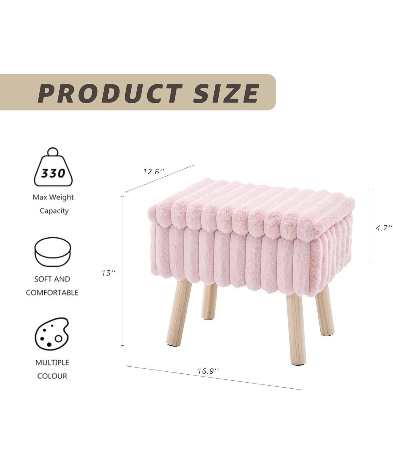 Chic and space-saving, this pink faux fur storage ottoman doubles as a seat, footrest, coffee table, and storage box. With a hidden compartment and sturdy wood legs, it’s the perfect multifunctional piece for tiny homes, apartments, or any small space.